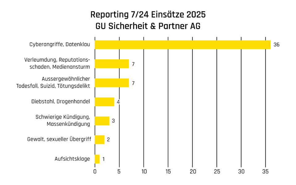 Im Jahr 2023 hat die GU Sicherheit & Partner AG diverse Unternehmen und öffentliche Institutionen in 45 Krisenfällen begleitet. Im Vergleich zum 2022 waren die Kriseneinsätze komplexer und längerdauernder. Nachfolgend finden Sie einen Überblick über die Art der bewältigten Krisenfälle.